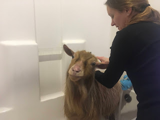 Oscar is officially the first goat to have made it upstairs in our house. After a back-breaking carry from the barn to the house, that at times required two people (who would have thought he was so heavy!), Oscar finally made it upstairs to the tub on vet's orders.